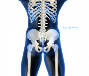 Katso alla olevaa kuvaa jossa näkyy suoliluiden yläreuna. Voit kokeilla katsoa itseäsi kokovartalopeilistä samalla kun laitat kätesi suoliluiden päälle kehon sivusta. Onko lantion eri puolet samalla tasolla? Jos lantio ei ole tasapainossa, niin sinulla on ainakin lantion virheasento. Lantion virheasento yleensä aiheuttaa myös erimittaiset jalat sekä S-muotoisen skolioosin.