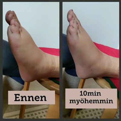Tässä kuva hoitotuloksesta. Kyseessä nyrjähtänyt nilkka joka on turvonnut ja mustelmilla.